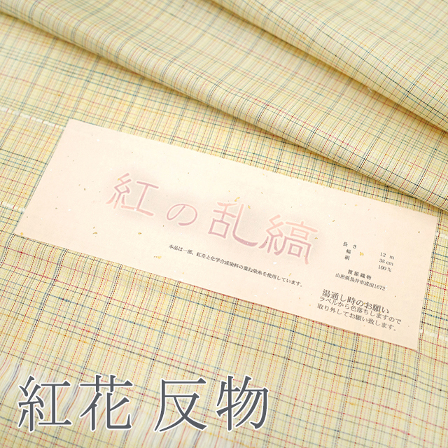 【新品】 紬 着尺 着物 反物 山形県 長井 渡源織物 紅の乱縞 正絹 絹 淡黄色 乱縞 格子 カジュアル ショッピング お食事 観劇 コンサート お稽古など つむぎ きもの 反物 袷 単衣 未使用 未仕立て品 新品 みやがわ sb12147