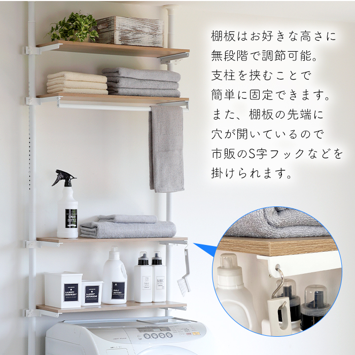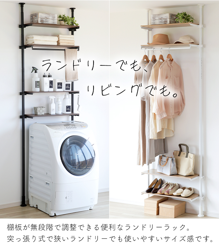 ランドリーラック 突っ張り 4段 極太パイプ ランドリー収納 洗濯機上収納 タオル掛け