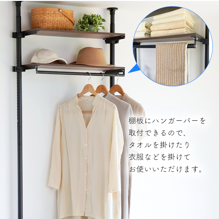 棚板の前方にハンガーパイプを取り付ける事が出来るので、タオルやバスマットを掛けたり、簡易物干しとして使用が出来ます。