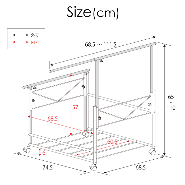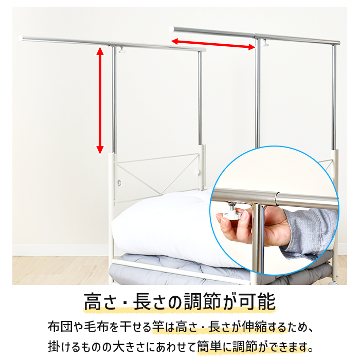 干す物に応じてサイド高さも最大110cmに調整でき、快適な布団干しを実現します。