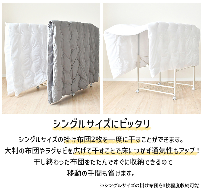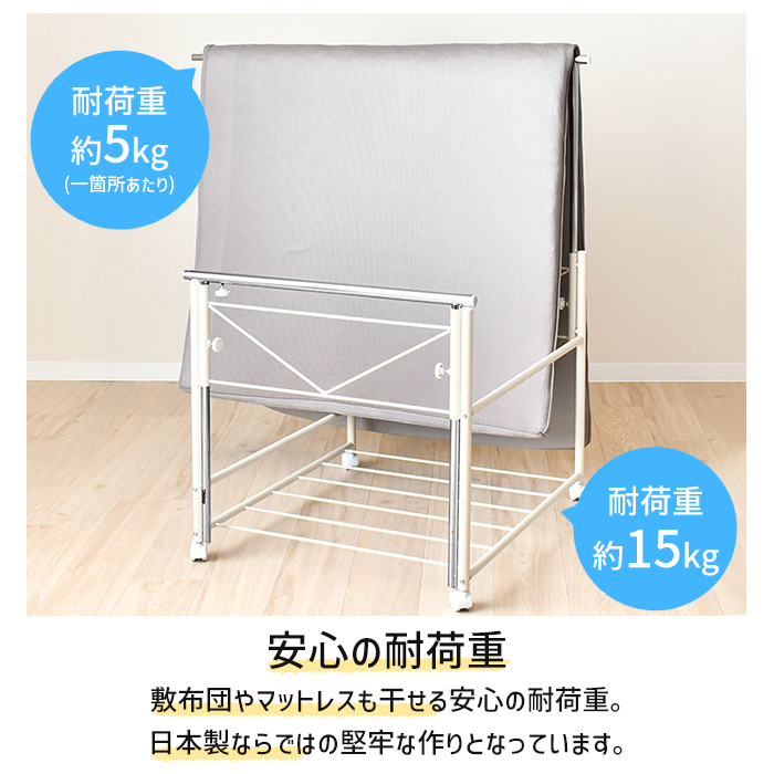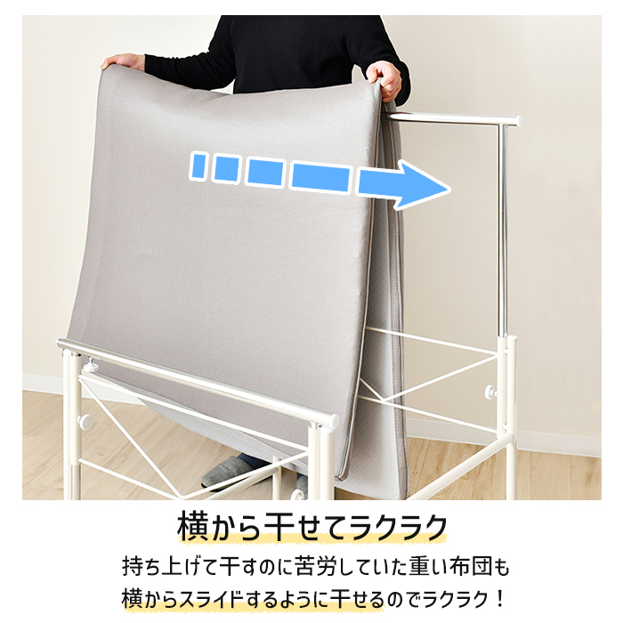 敷布団やマットレスを持ち上げずに横から干せる構造のため、重たい寝具でもラクに干せます。