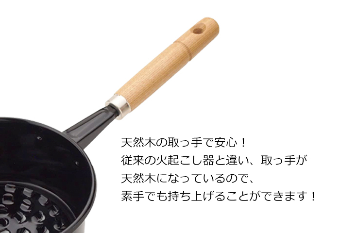 従来の火起こし器と違い、持ち手が天然木で作られているので素手で持ち上げることができて便利。