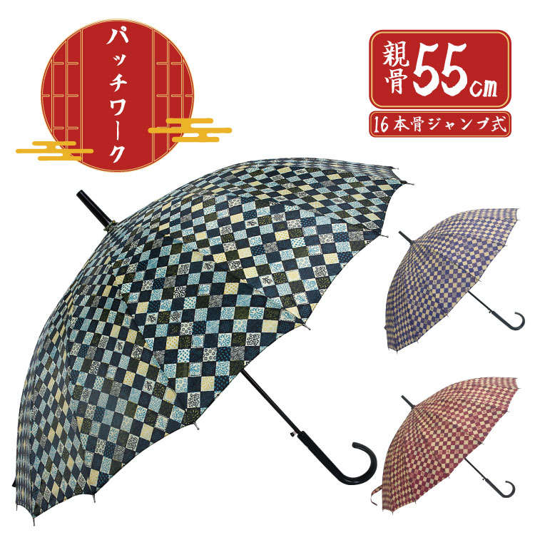長傘 16本骨 55cm ジャンプ 和柄 パッチワーク UVカット付