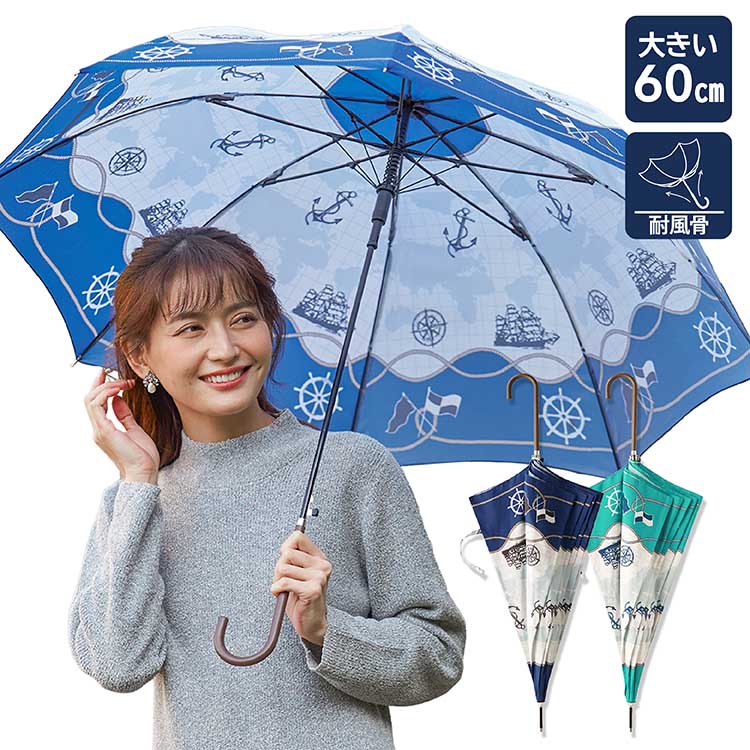 レディース長傘 60cm ジャンプ マリンスカーフ柄 PUレザー使用 風に強い スリム耐風骨使用 軽量 2色