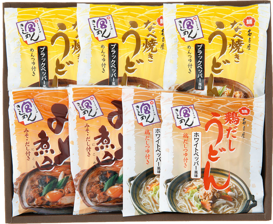 黒コショウがピリッと利いたなべ焼きうどんと、ホワイトペッパーが辛味アクセントとなった白湯風の鶏だしうどん、100%大豆醸造の赤みそを使用したこくのあるみそ煮込きしめんの詰合です。