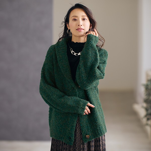 多色の糸が奏でる色合いとふわふわの風合いに上質感が漂い、ショールカラーのエレガントな表情も贅沢感のある一着です。