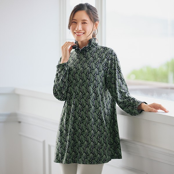 チュニック 大人可愛い おしゃれ 春 秋冬 ミセス シニア ファッション 40代 50代 60代 70代 リーフプリントカットソーチュニック