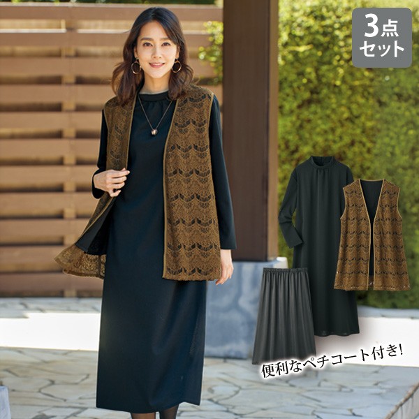 セットアップ レディース おしゃれ 秋冬 ミセス シニア ファッション 40代 50代 60代 70代 総レースジレ&ジャージーワンピース