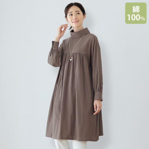 ゆったりとしたロールネックやたっぷりギャザーが広がる優しいシルエットを、ニュアンスカラーでほんのりモードに。