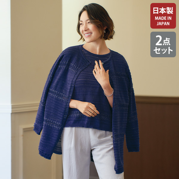 繊細なラメ糸を編み込みながら、立体的な横畝や透かし柄が表現された日本製ニットアンサンブル。
