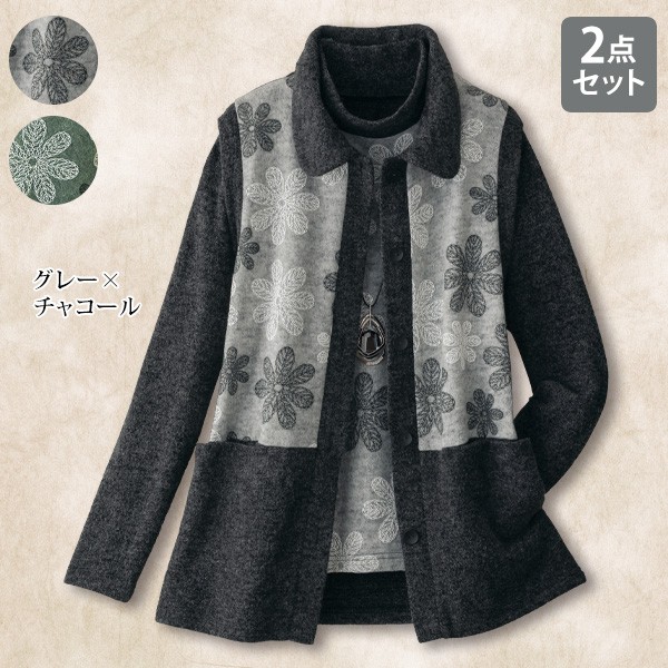 アンサンブル ベスト レディース おしゃれ 秋冬 40代 50代 60代 70代 80代 ミセス シニア ファッション 刺しゅう風プリント アンサンブル