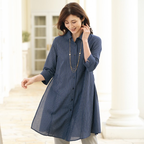 チュニック 大人可愛い おしゃれ 春夏 ミセス シニア ファッション 40代 50代 60代 70代 80代 変わり織りストライプフレアチュニック