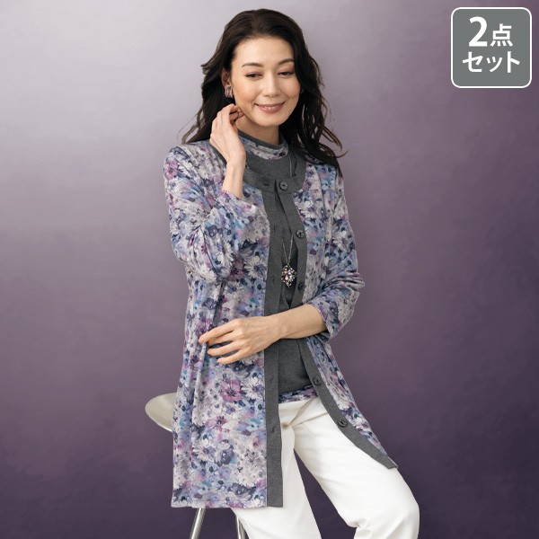 アンサンブル レディース おしゃれ ミセス シニア ファッション 40代 50代 60代 70代 80代 花柄プリントカットソー ロングカーディガンアンサンブル