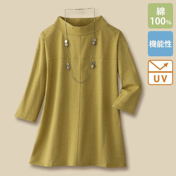 身体のラインを拾いにくい綿100%素材のハイネックチュニック。
