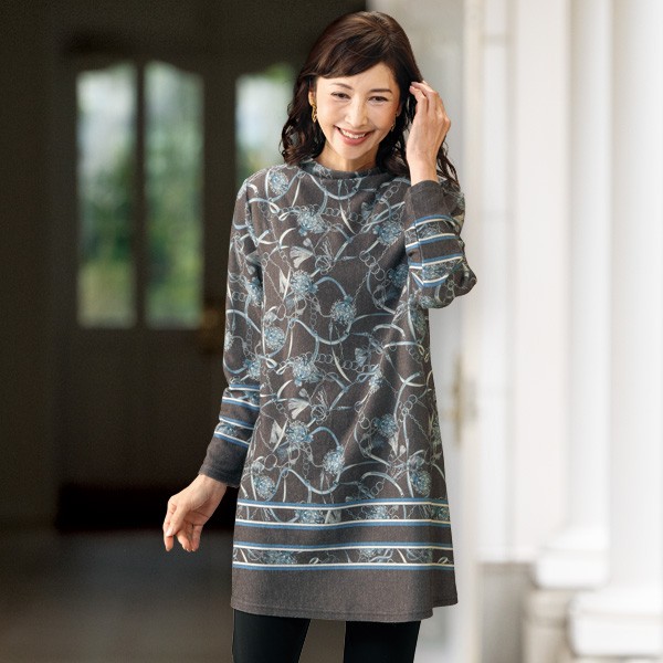 チュニック 大人可愛い おしゃれ 秋冬 ミセス シニア ファッション 40代 50代 60代 70代 80代 ベルト柄パネルプリント起毛チュニック