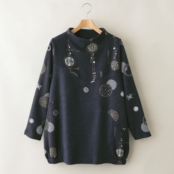 柔らかなカットソーに和柄のモチーフを切り替えたボトルネックチュニック。