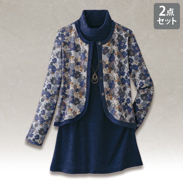 優しい花柄が印象的なボレロカーディガンにタートルネックのチュニックをセットしたアンサンブルです。