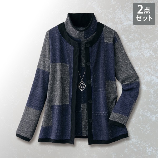 ステッチ風デザインがかわいいブロック柄のアンサンブルは、ハンサムな配色と黒のラインがモダンな印象。