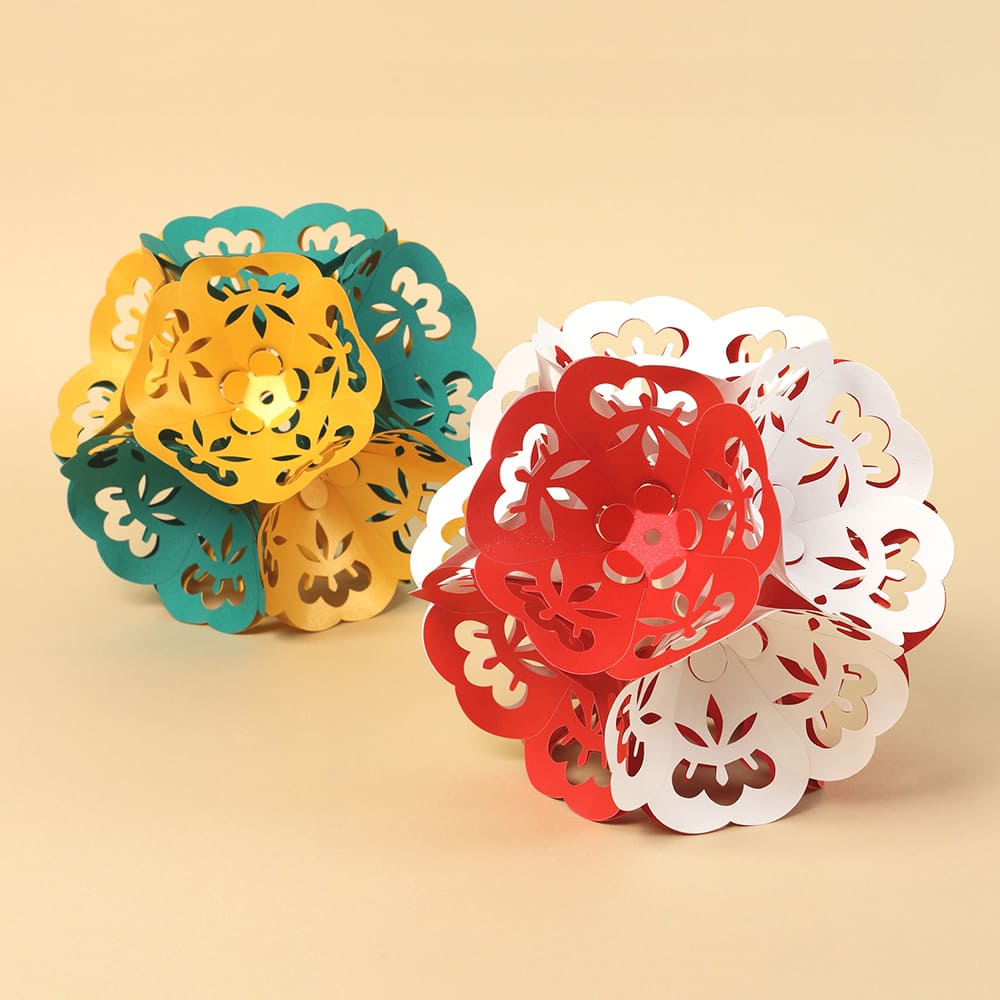 花びらのように切り抜かれた紙を立体的に組み合わせて手まりを作るアートキットです。