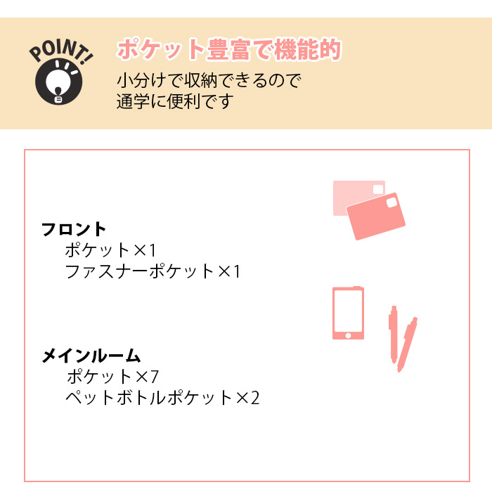 メインルーム(内部にポケット×7、ペットボトルポケット×2)