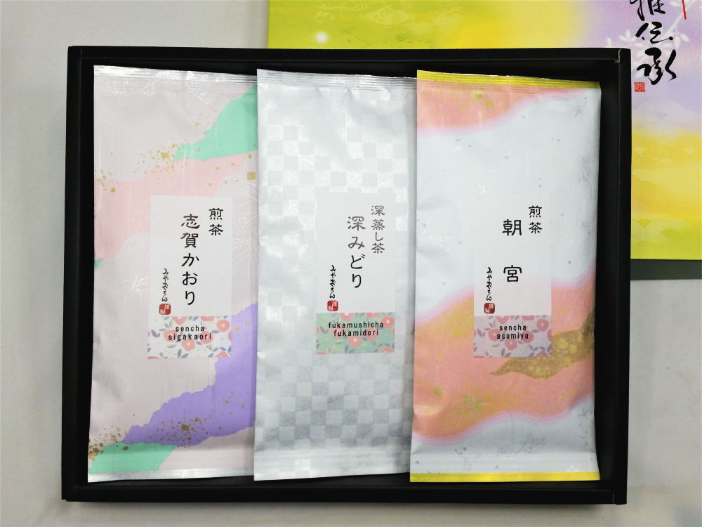 内容量 煎茶志賀かおり・煎茶朝宮・深蒸し茶深みどり 各100g