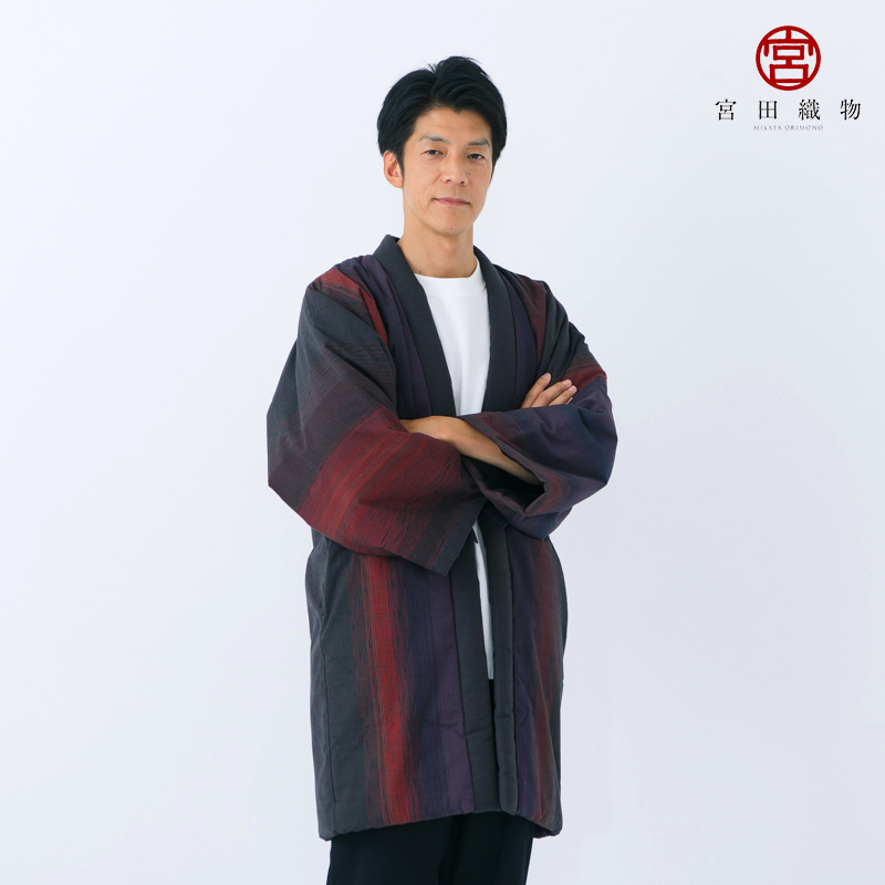 黒をベースとした生地に赤や紫へのグラデーションの織柄が印象的なわた入れ半纏です。