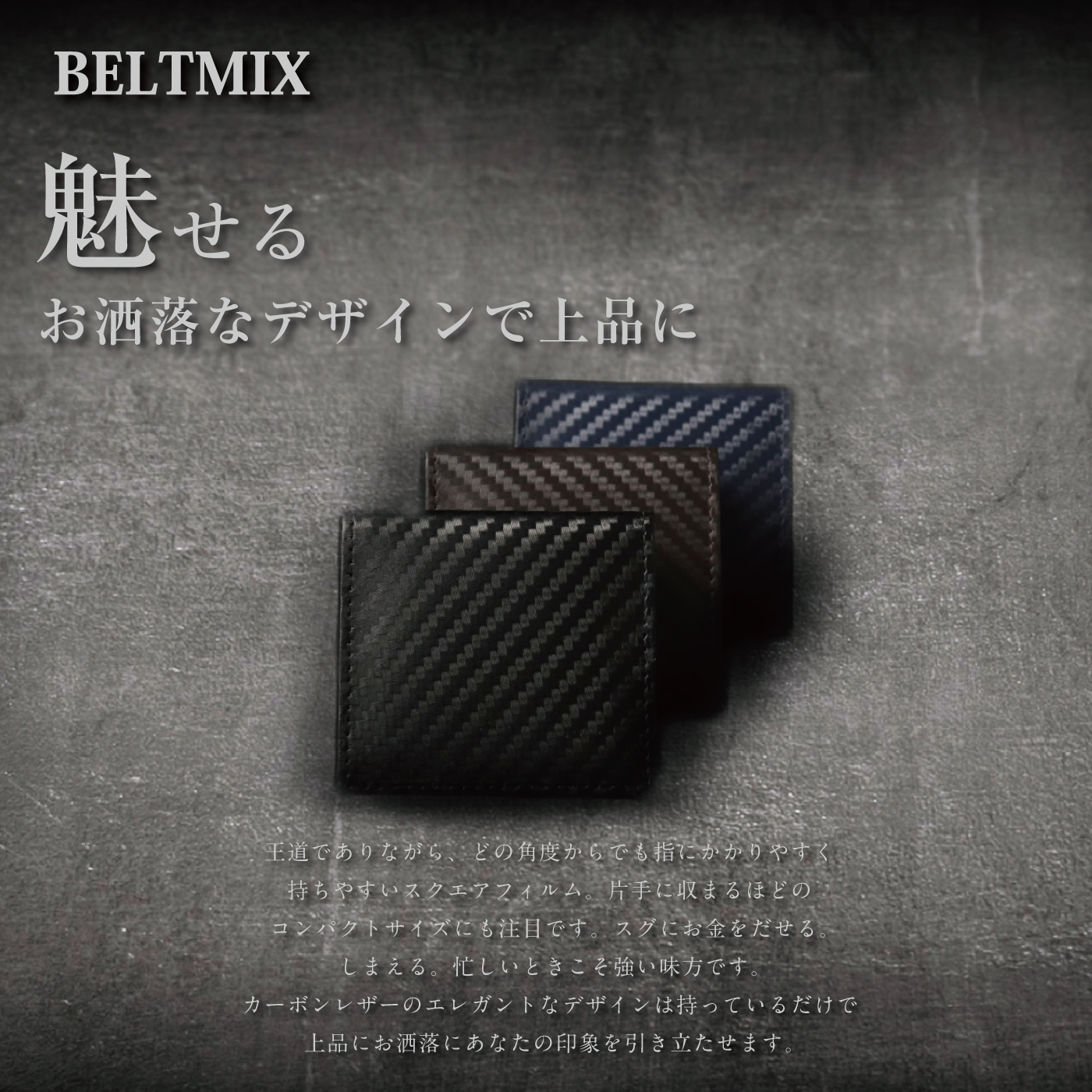 王道でありながら、どの角度からでも指にかかりやすく持ちやすいスクエアフォルム。片手に収まるほどのコンパクトサイズにも注目です。スグにお金を出せる、しまえる。忙しいときこそ強い味方です。カーボンレザーのエレガントなデザインは持っているだけで上品にお洒落にあなたの印象を引き立たせます。