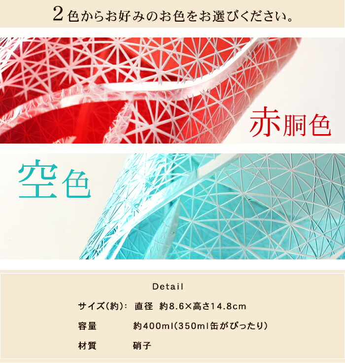 切子でビールなんて素敵ですね。2色からお好みのグラスをお選びください。