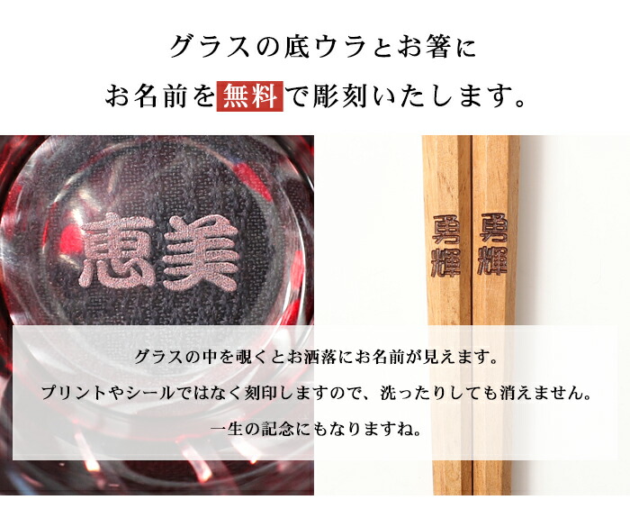 世界で一つの名入れギフト。お箸とグラスの底ウラにお名前を無料で彫刻いたします。