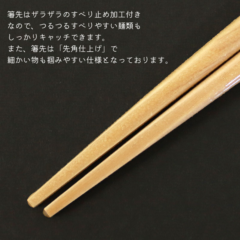 使うたびに手に馴染み、日常に彩りを添えてくれます。 毎日、口に運ぶものだから、お気に入りの一膳を。 お気に入りの箸で毎日の食事をこだわりたい。 普段使いの生活箸としておすすめの上質なお箸です。 箸先はザラザラのすべり止め加工付きなので、つるつるすべりやすい麺類もしっかりキャッチできます。 手に持てば指先にやさしく、口に運べば口当たりやわらかく。 自然のぬくもりを感じさせる木製品は、長く使うほどに手になじみ、つややかな風合いが加わります。 食洗機対応ですので洗い物も楽になります。