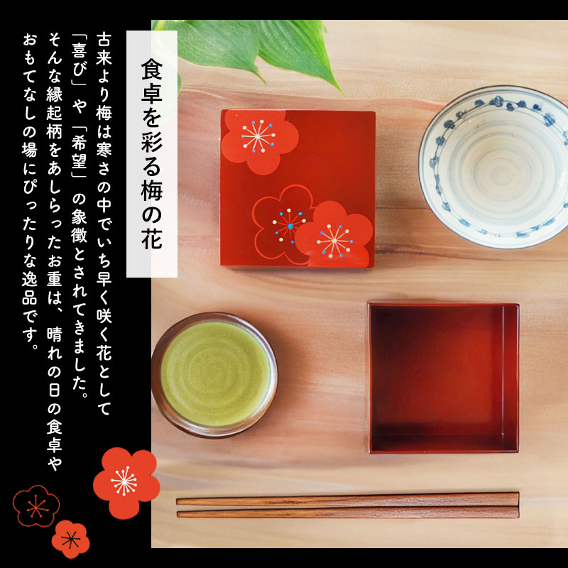 古来より梅は、寒さの中でいち早く咲く花として「喜び」や「希望」の象徴とされてきました。 そんな縁起の良い梅柄をあしらったお重は、晴れの日の食卓やおもてなしの場にぴったり。 朱の華やかさが、お料理をいっそう引き立ててくれます。 和洋中問わず、どんなお料理とも相性◎。