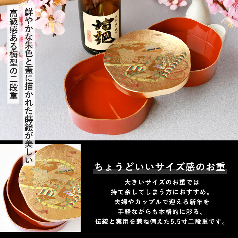 日本の伝統的な柄が美しい、可憐な梅の花をかたどった、5.5寸の二段重です。 大きいサイズのお重では持て余してしまう方にぴったりで、夫婦やカップルなど少人数で迎える新年を、気軽ながらも本格的なお重で祝うことができます。
