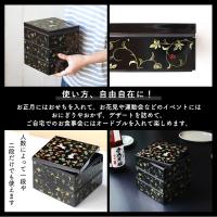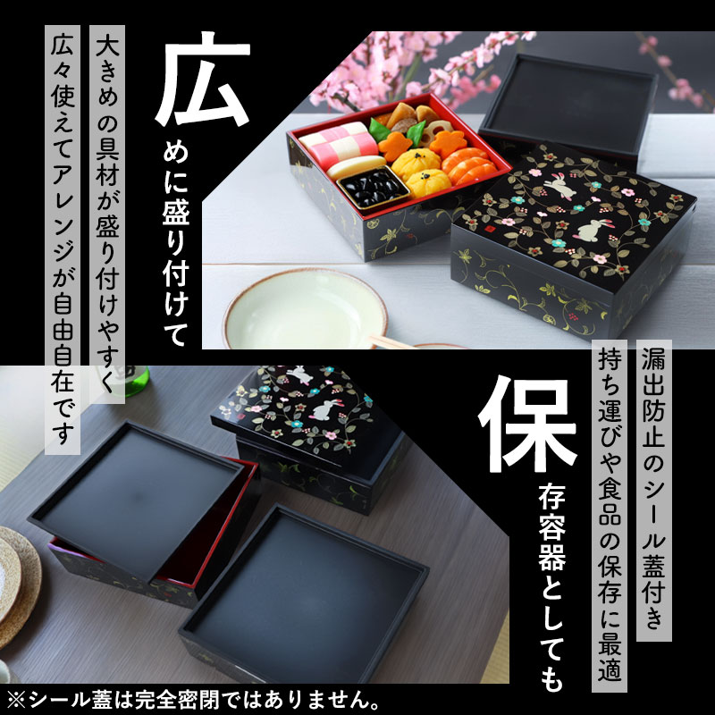 お正月にはおせちを入れて。 お花見や運動会などのイベントにはおにぎりやおかず、デザートを詰めて。 桃の節句にも使え、祝いの席を華やかに彩ります。 ご自宅でのお食事会にはオードブルを入れて楽しめます。 また、人数によって一段や二段だけでもお使いいただけます。 |