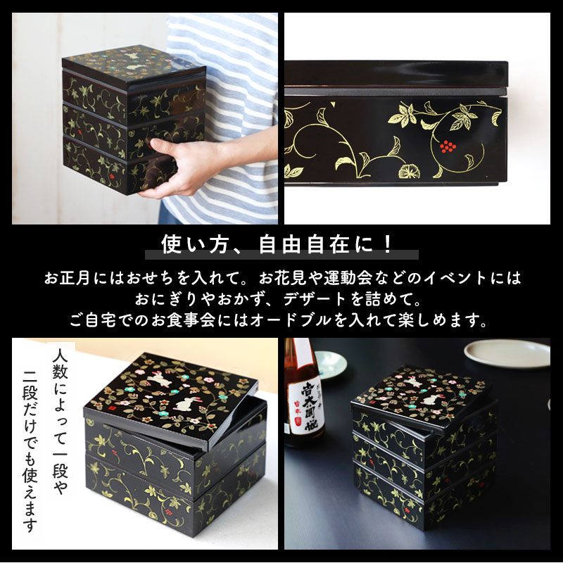 昔から月の使いと言われ、「ツキ」を呼ぶとされるうさぎの縁起柄が可愛らしく、上品で高級感のある金色の小花柄が描かれた黒色の三段重。