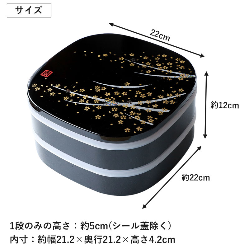 本体:幅22×奥行22×高さ12cm 一段のみの高さ:5cm(シール蓋除く) 内寸:幅21.2×奥行21.2×高さ4.2cm |
