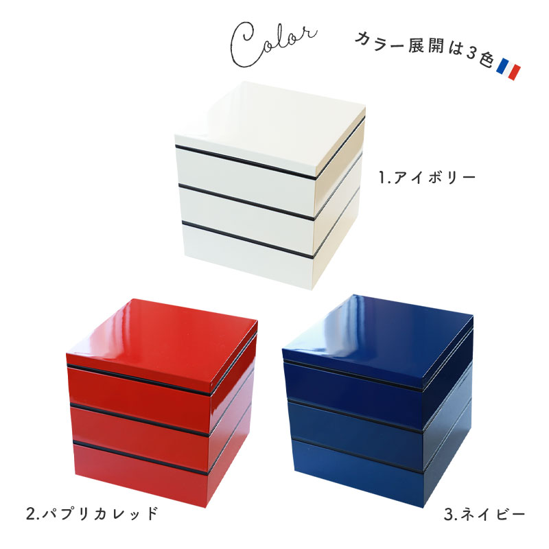 アイボリー・パプリカレッド・ネイビーの無地で、使いやすくシンプルなカラーが魅力。年中活躍してくれる重箱です。