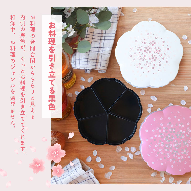 桜をかたどった可憐なフォルムに、白とピンクのやさしい色合い。小さな桜模様があしらわれた、華やかで愛らしい二段重です。