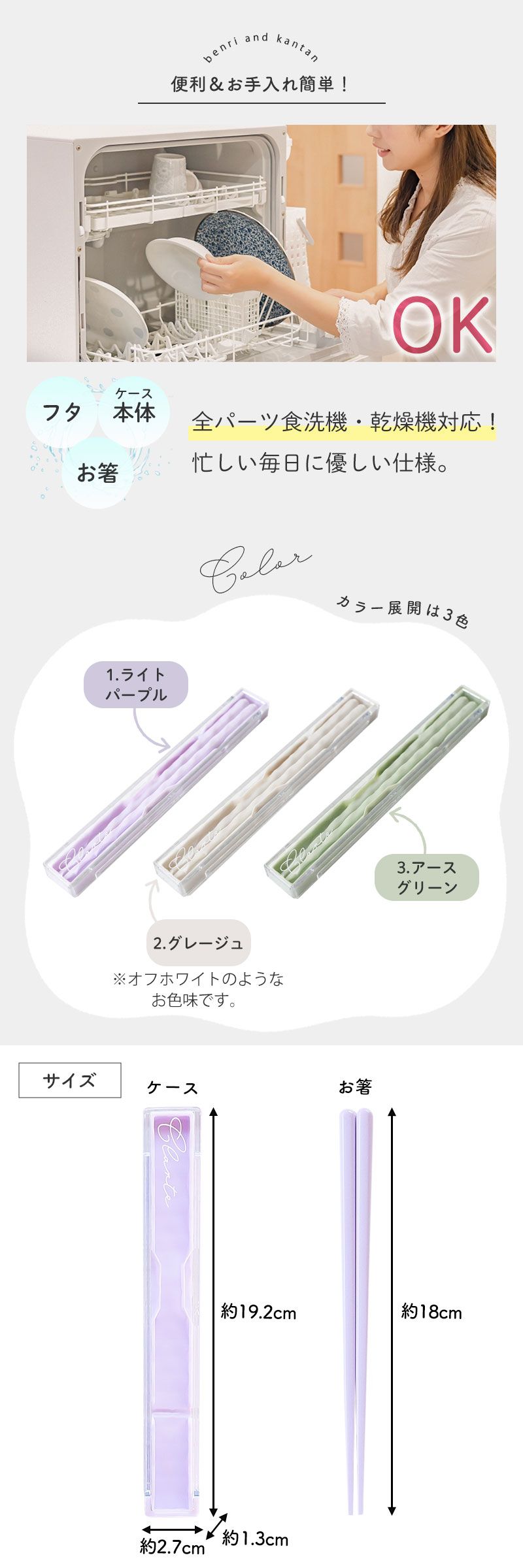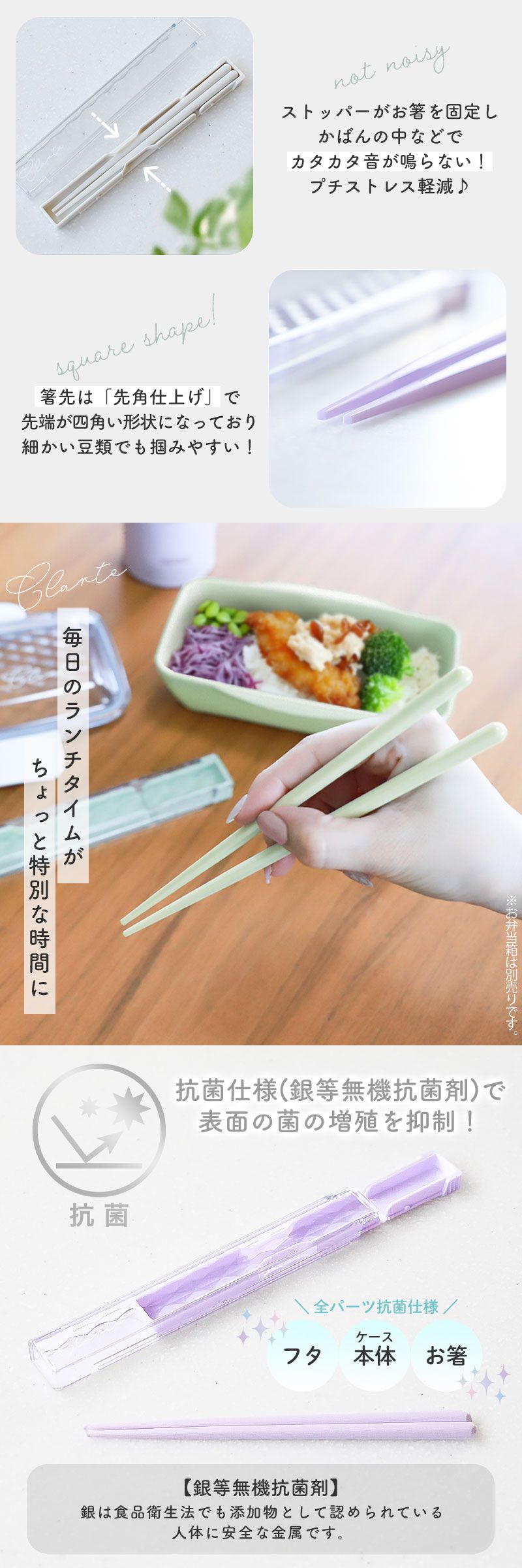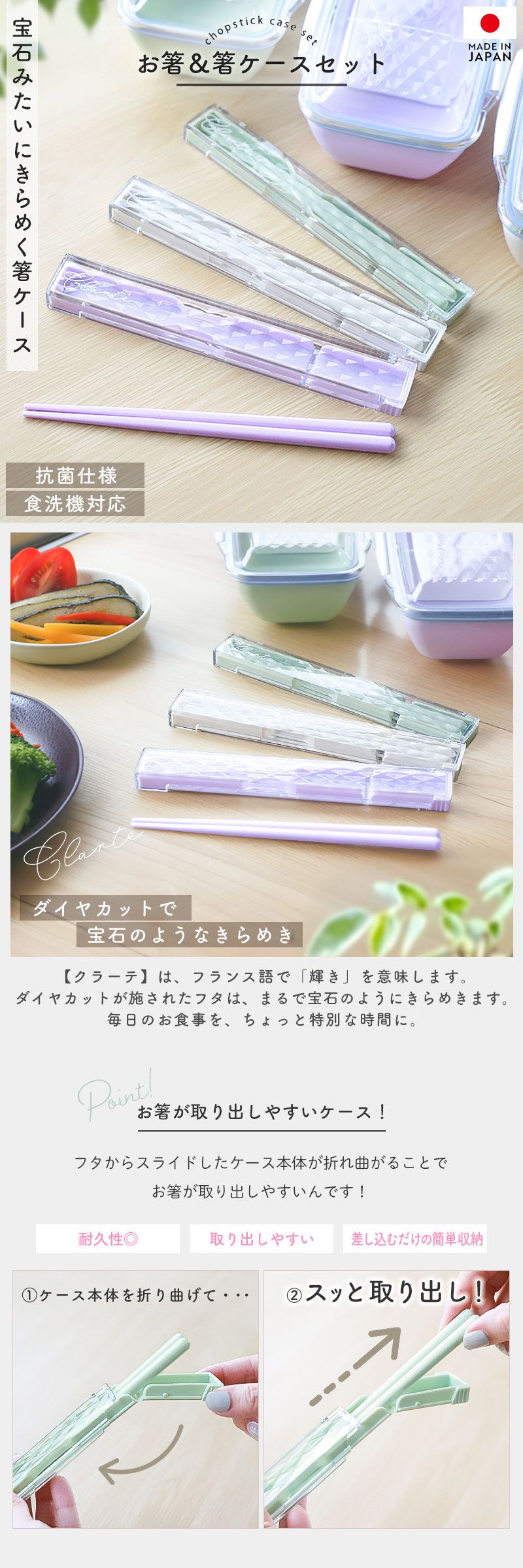透明感のあるクリアなフタ、シンプルだけど華やかさもある上品なお箸と箸箱のセットです。 箸先は四角形になっている「先角仕上げ」なので、細かい豆類もつかみやすくなっています。 箸箱の本体が折れ曲がる構造なので、お箸を取り出しやすいです。 箸箱の本体内側にあるストッパーがお箸を固定し、歩いた時にバッグの中でお箸がカタカタ音が鳴らない仕様で、プチストレスの軽減に♪ 更に、抗菌剤が配合されているので、細菌の繁殖を抑制してくれます。 【クラーテ(Clarte)とは】 フランス語で「光」「かがやき」「透明」を意味します。 ダイヤカットが施されたフタは、繊細にきらめき、上品な存在感。 宝石のような輝きを持つお箸&箸箱セットで、毎日のお食事をちょっと特別な時間に。