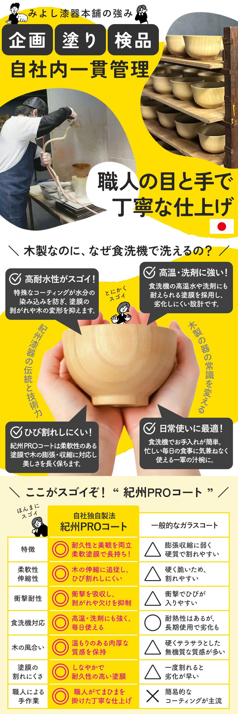 紀州漆器の職人が丁寧に仕上げた「紀州PROコート」により、木製なのに食洗機対応。 耐久性・耐水性に優れ、毎日の食卓で気兼ねなく使えます。