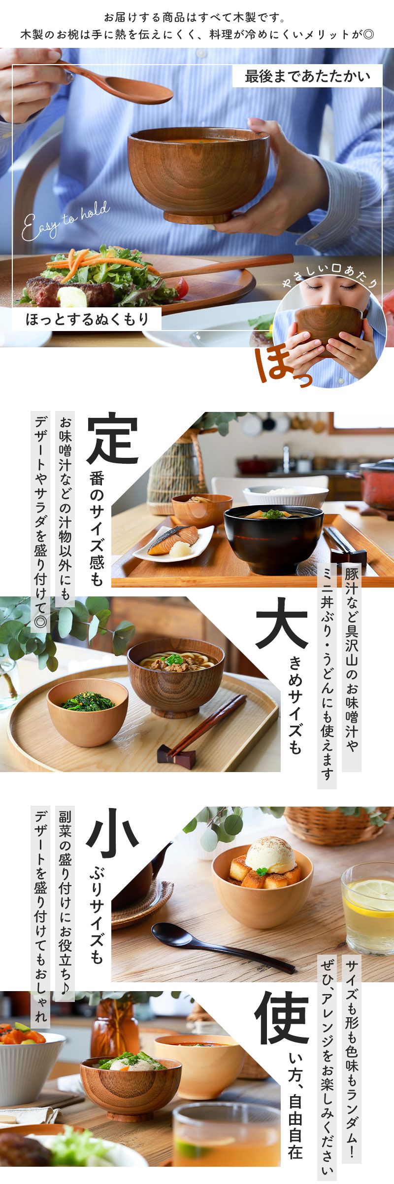 【サイズ・用途いろいろ】 定番サイズはお味噌汁に、大きめは具沢山汁物や丼に、小ぶりは副菜やデザートに◎ 木製椀は手に熱が伝わりにくく、やさしい口あたりで、料理が冷めにくいのも魅力です。