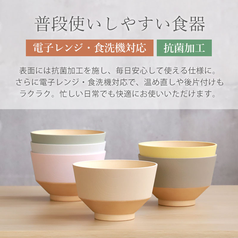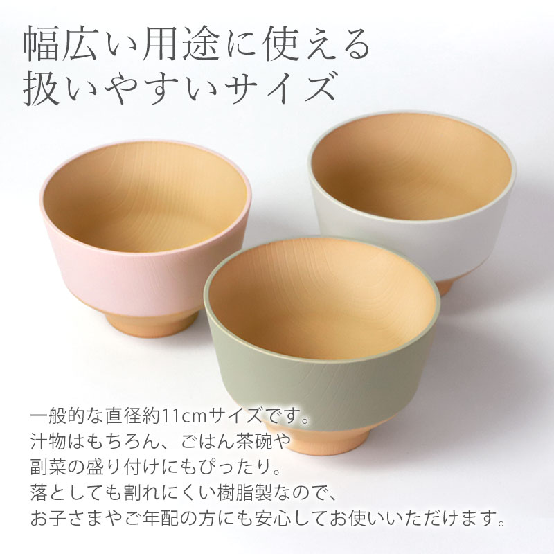 ■扱いやすく、幅広い用途に使えるサイズ 一般的な直径約11cmサイズです。汁物はもちろん、ごはん茶碗や副菜の盛り付けにもぴったり。 落としても割れにくい樹脂製なので、お子さまやご年配の方にも安心してお使いいただけます。