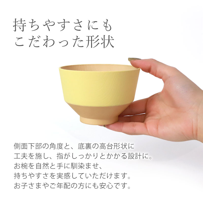 ■持ちやすさにもこだわった形状 側面下部の角度と、底裏の高台形状に工夫を施し、指がしっかりとかかる設計に。 お椀を自然と手に馴染ませ、持ちやすさを実感していただけます。お子さまやご年配の方にも安心です。