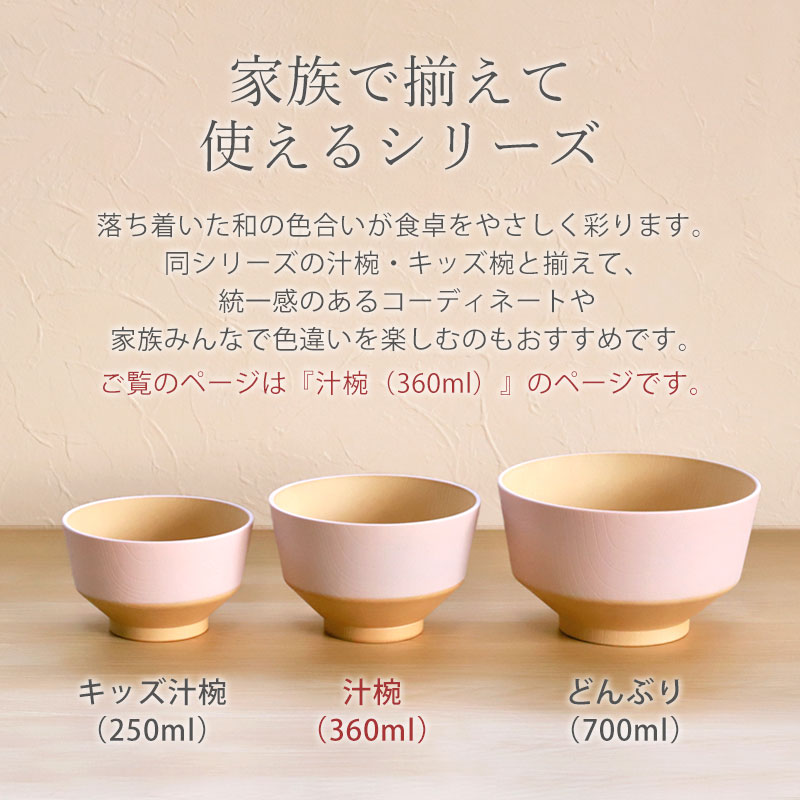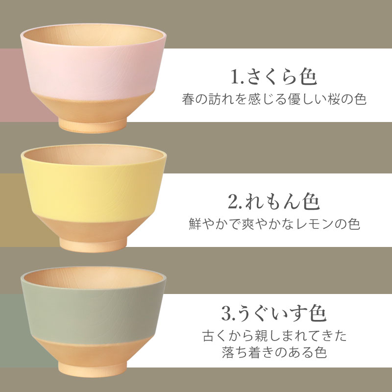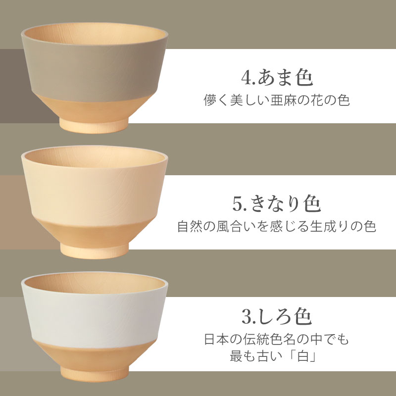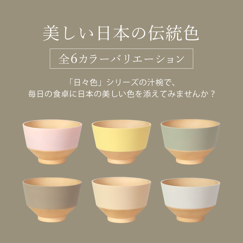 日本の自然や文化から生まれた美しい伝統色をまとった、扱いやすい樹脂製の汁椀です。 毎日の食卓に彩りを添える「日々色」シリーズのひとつとして、家族みんなで安心してお使いいただけます。