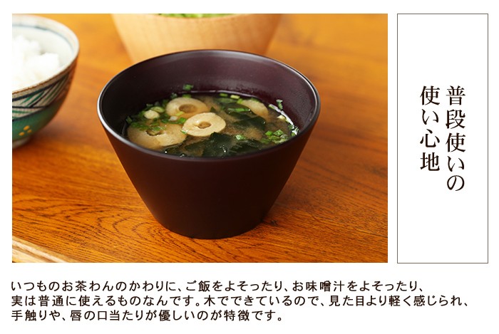 また、木製のお椀は熱伝導率が低いので冷めにくく、最後まで温かいまま、召し上がる事ができます。