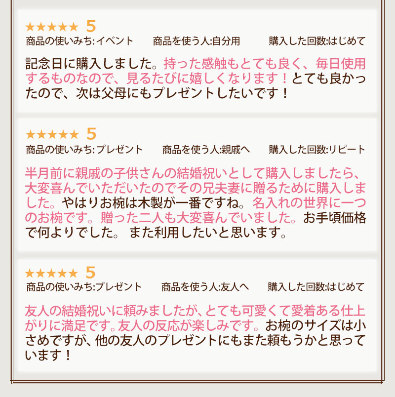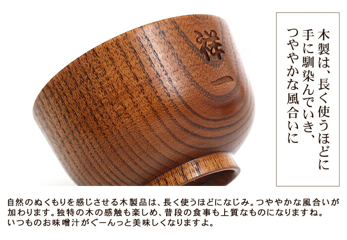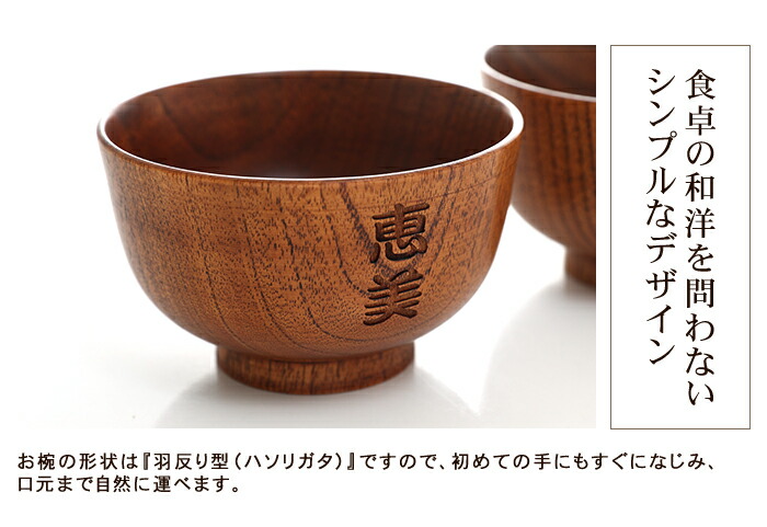 汁椀にそれぞれお名前を彫刻いたします。 あなただけのオリジナルギフトになります。もちろんご自宅用に、オリジナルマイ椀としてもどうぞ。 名入れの文字数は3文字程度までが最適です。それ以上になりますと、スペースの関係で文字サイズが小さくなってしまいます。予めご了承ください。 彫っていますので、よほどの事が無い限りお名前は消えません。 また、お名前自体が強調せず自然な感じで入っているのも魅力のひとつです。