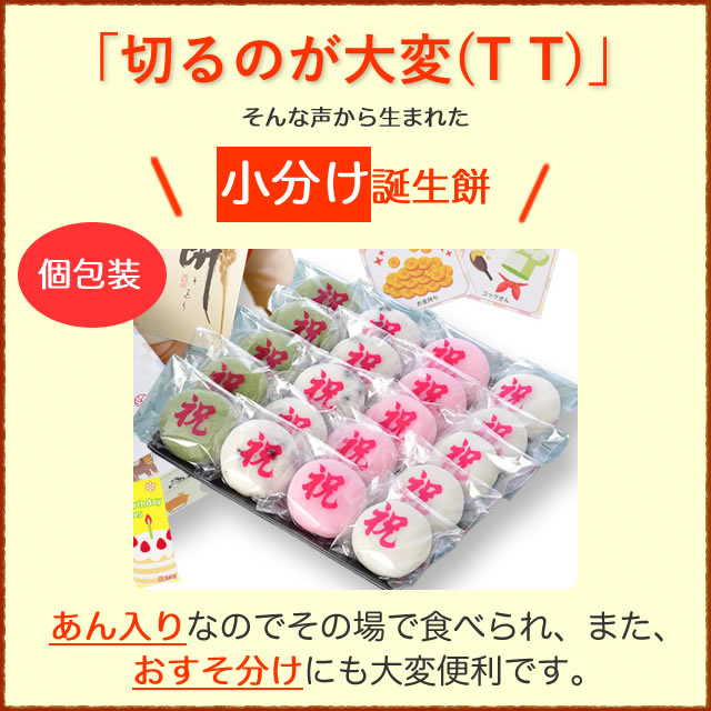 おすそ分け用の箱はこちらお祝いが終わったらお餅は、親戚やご近所などにおすそ分けして、沢山の幸せが訪れるように、なるべく多くの人達に召しあがっていただきたい。当店人気の誕生餅です。冷凍便、冷凍商品同梱可。のし名入れできます。備考欄に名入れ希望と記入していただき、お名前を記入してください。