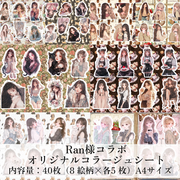 コラージュシート 素材紙 a4デザインペーパー 人物 女の子 Ran様 コラボ ネコ 犬 カフェ デザインペーパー セット a4 コラージュ素材 紙もの ペーパー