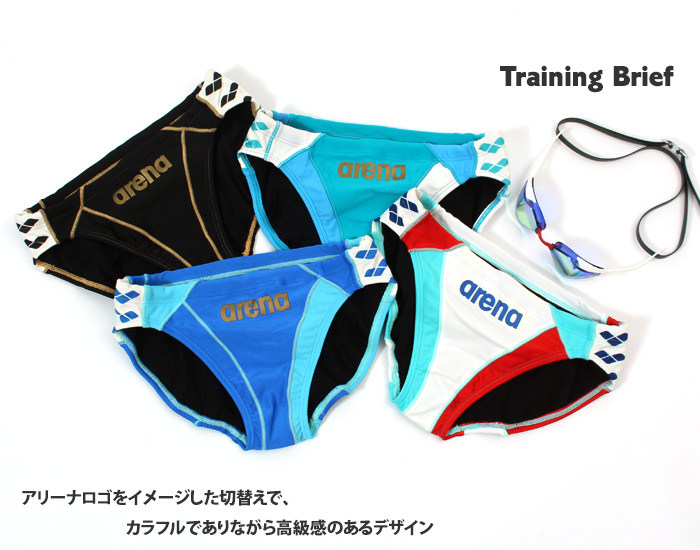 サイドにアリーナロゴを配置しスポーティーなデザインのブリーフタイプの水着。アリーナロゴをイメージした切替えで、カラフルでありながら高級感のあるデザイン。前身頃と後身頃に黒の裏地付き。