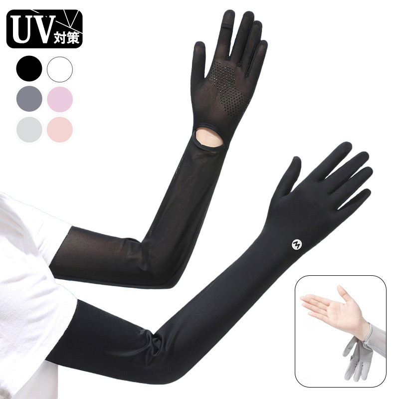 メール便送料無料 アームカバー UV ロング 手袋 レディース グローブ 5本指 指あり 紫外線対策 日焼け対策 UV対策 二の腕 ゴム入り サイズ調整 滑り止め メッシュ 通気性 スマホ対応 操作 人差し指 スリット 手元 出せる プレゼント ロゴ 無地 黒 白 夏