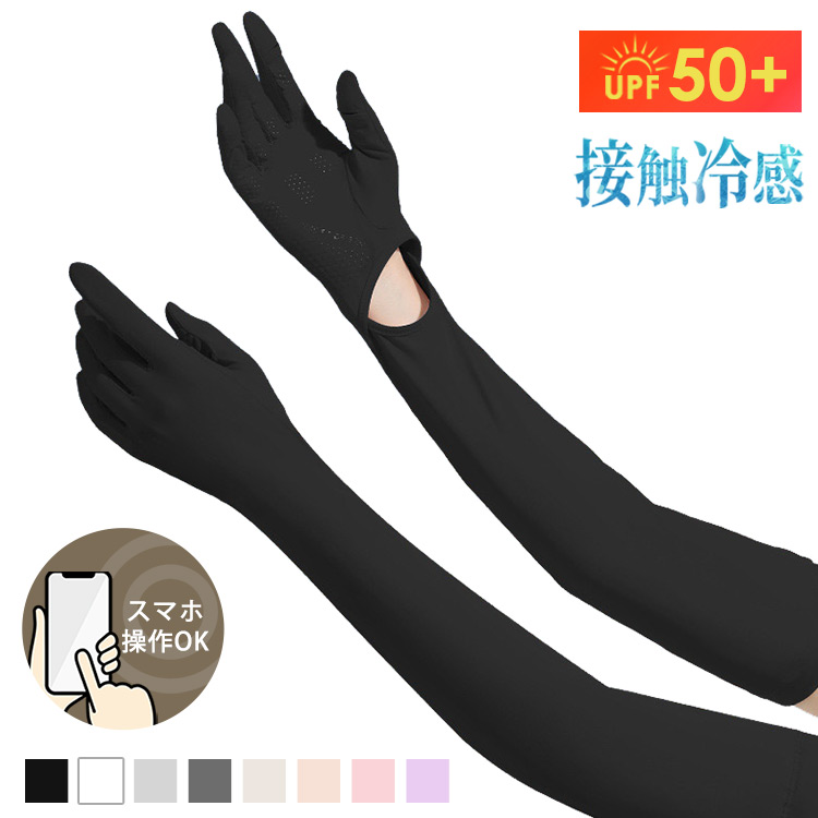 メール便送料無料 UVカット率 99%以上 アームカバー ロング 手袋 レディース グローブ 5本指 指あり UPF50+ 紫外線対策 日焼け対策 UV対策 接触冷感 伸縮性 二の腕 ゴム入り サイズ調整 滑り止め スマホ対応 操作 人差し指 親指 スリット 指切り 手元 出せる プレゼント ギフト 無地 黒 白 夏